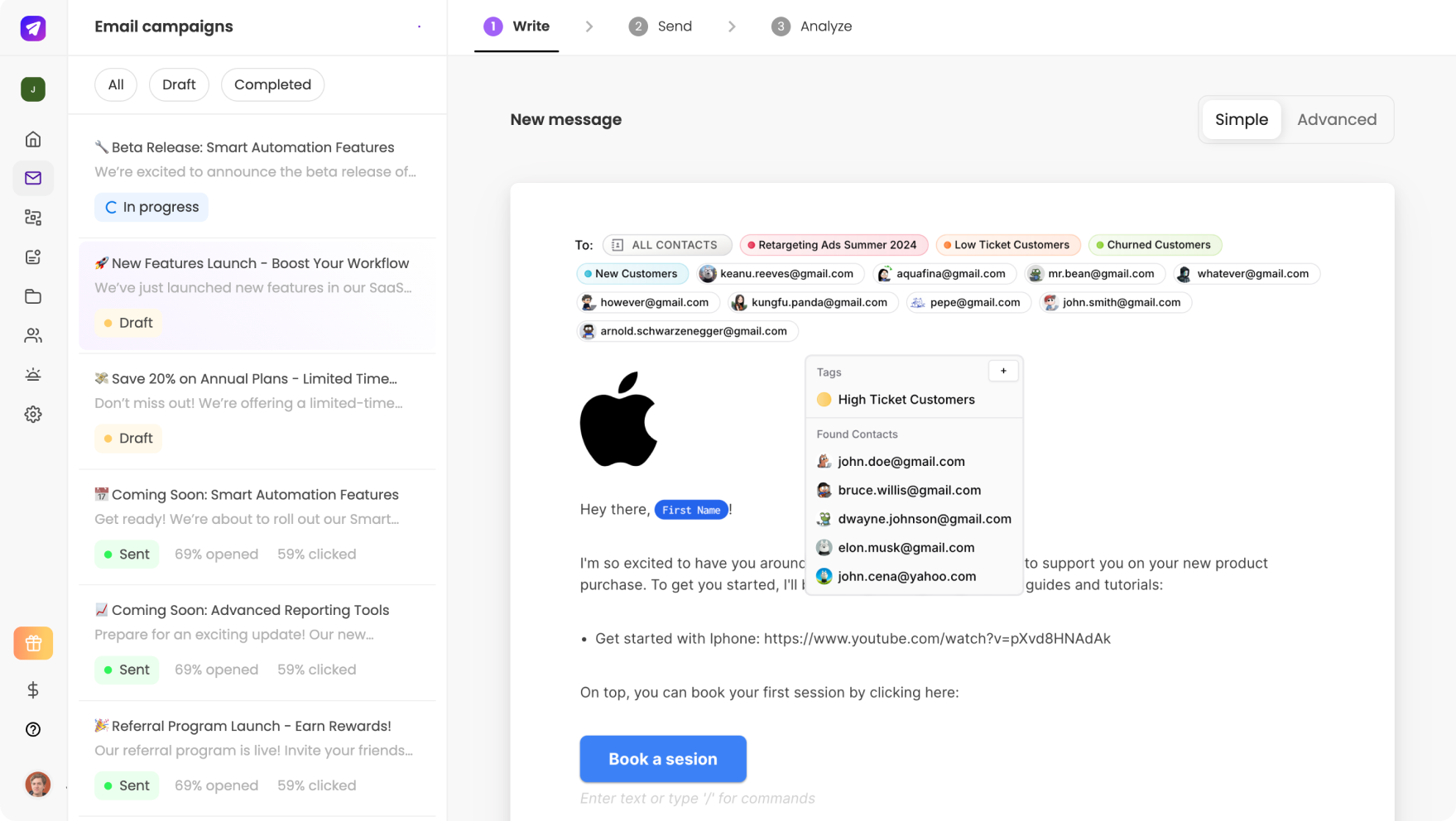 Expansion & upsells: trigger emails on usage milestones, new features, and price tiers.